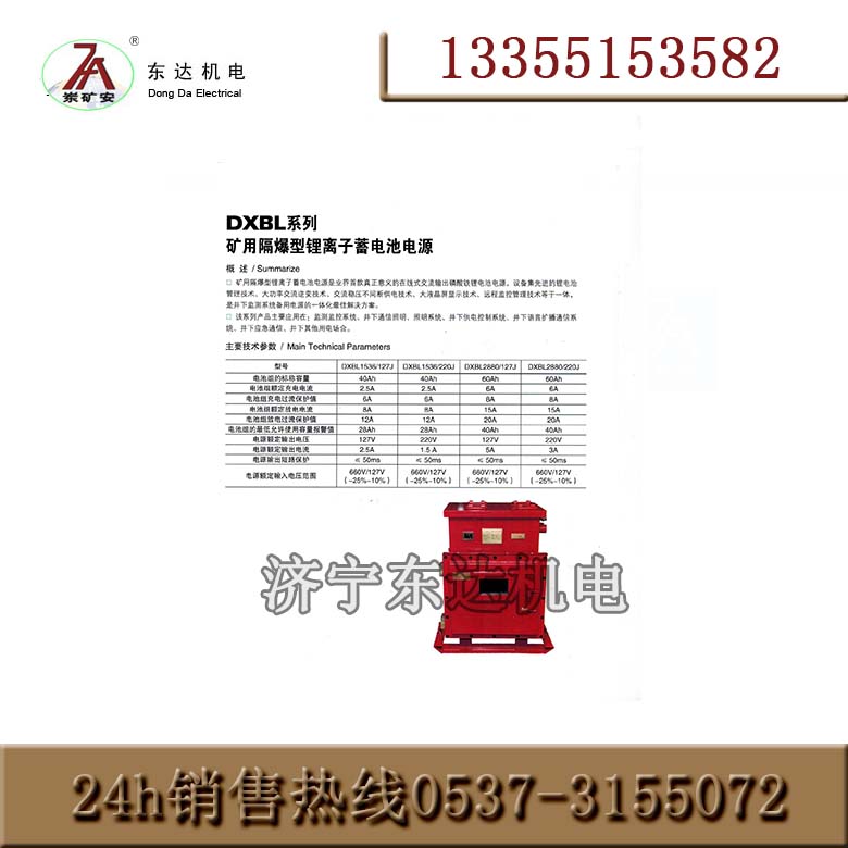 DXBL1536/127J矿用隔爆型锂离子蓄电池电源是首款真正意义的在线式交流输出(磷酸铁)锂电池电源,隔爆型锂离子蓄电池电源是集先进的锂电池管理技术、大功率交流逆变技术、交流稳压不间断供电技术、大液晶屏显示技术、远程监控管理技术等于一体,是井下监测系统备用电源的一体化最佳解决方案。济宁东达机电刘经理,13355153582(微信同号)/0537-3155072